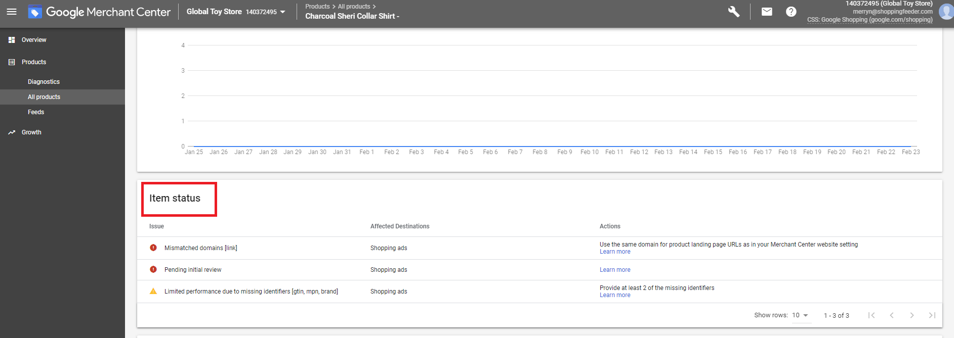 Here we see that this has a mismatched domain issue and missing identifiers, which is likely the reason behind the pending review. As you can see in the Actions column on the extreme right, the merchant center tells you exactly what is required of you to get this product approved: